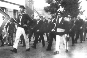 | Junggesellen in Bodendorf 1934: Fähnrich G. Buchet, Präses A. Simon (Buhrsch Tun) mit Zweispitz, Schärpe und Degen als Zeichen seines Amtes |